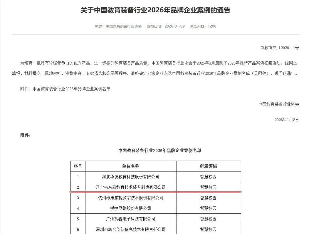 2026年1月8日,中国教育装备行业协会正式发布《关于中国教育装备行业2026年品牌企业案例的通告》,辽宁省东泰教育技术装备制造有限公司凭借扎实的行业积淀、突出的技术创新能力及卓越的产品服务品质,成功获评“中国教育装备行业2026年品牌企业”!此次评选全国仅94家企业入选,这份荣誉是行业对东泰公司综合实力的高度认可,更是对我们深耕教育装备领域初心的最佳印证!